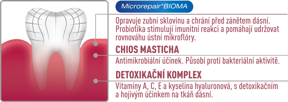 Zubní pasta a žvýkací žvýkačky s microRepair®BIOMA obohacené o probiotika s inovativním účinkem podporují udržení normální ústní mikroflóry a pomáhají předcházet zánětům a krvácení dásní. Zubní pasta Biorepair® PERIBIOMA® PRO také opravuje sklovinu a chrání linii dásní před napadením bakteriemi díky antimikrobiálnímu působení chioské mastichy. Receptura je zdokonalena o vitaminový komplex s kyselinou hyaluronovou s detoxikačním, antioxidačním a regeneračním účinkem na gingivální tkáně.