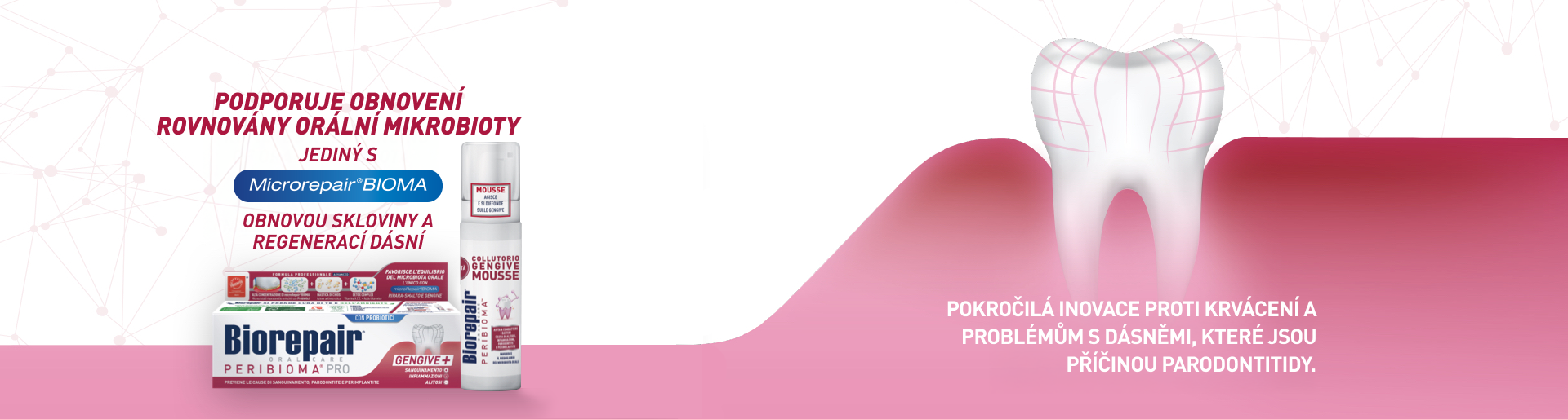 Zubní pasta a žvýkací žvýkačky s microRepair®BIOMA obohacené o probiotika s inovativním účinkem podporují udržení normální ústní mikroflóry a pomáhají předcházet zánětům a krvácení dásní. Zubní pasta Biorepair® PERIBIOMA® PRO také opravuje sklovinu a chrání linii dásní před napadením bakteriemi díky antimikrobiálnímu působení chioské mastichy. Receptura je zdokonalena o vitaminový komplex s kyselinou hyaluronovou s detoxikačním, antioxidačním a regeneračním účinkem na gingivální tkáně.